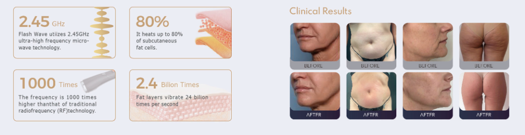 Ongeveer 80% van de energie richt zich direct op adipocyten (vetcellen) en verwarmt deze tot 50-55 °C, waardoor natuurlijke apoptose (celdood) wordt geactiveerd.
